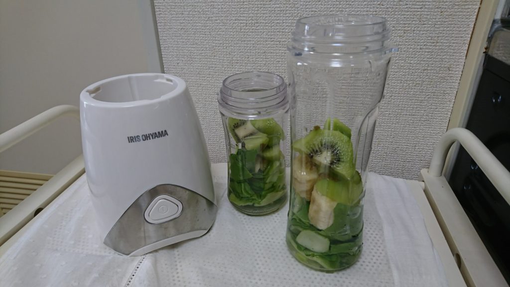 バナナは手でちぎって、小松菜は軽く洗って手でちぎって、キウイは軽く皮をむいて、あとは水を入れて回転するだけで完成!!作成に5分かからないと思います。